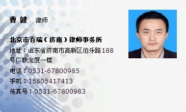 曹健律師,北京百瑞(濟南)律師事務所專職律師,中共黨員,民商法碩士,中華全國律師協(xié)會會員。同時擔任廣發(fā)濟南分行、銀聯(lián)棗莊分公司、諸城市風生水起有限責任公司等多家企業(yè)的法律顧問,濟南經(jīng)濟廣播電臺嘉賓律師,山東公共頻道《民生直通車》欄目組特邀律師。 曹健律師先后服務于浦發(fā)銀行、山東銀聯(lián)擔保公司等金融企業(yè),積累了豐富的金融信貸實務經(jīng)驗,對銀行信貸、企業(yè)融資業(yè)務擁有豐富經(jīng)驗。自執(zhí)業(yè)以來,曹健律師已先后承辦十數(shù)起辯護成功的刑事案件以及大量民商事案件,積累了豐富的案件受理、財產(chǎn)保全、強制執(zhí)行業(yè)務經(jīng)驗。除訴訟案件以外,還積極承接如公司設立、改制、破產(chǎn)、債轉股、資信調查、幫助中小企業(yè)融資等非訴業(yè)務。先后在《中國民商法律網(wǎng)刊》、《東岳論叢》等多類國內核心刊物上發(fā)表了《按份共有人優(yōu)先購買權若干問題探析》、《我國不動產(chǎn)登記制度的若干完善建議》、《關于執(zhí)行參與分配制度中的若干問題分析》等十數(shù)篇文章。 作為一名中國律師,要以誠實守信為職業(yè)理念,以忠于當事人為責任取向,以高舉法律之劍為客戶排憂解難為終極目的,本著當事人權益最大化的目標,北京百瑞律師事務所濟南分所曹健律師竭誠為您服務!