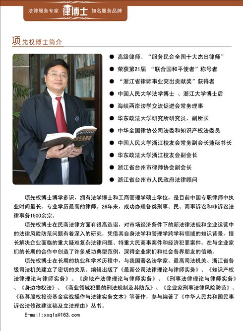 浙江新臺(tái)州律師事務(wù)所成立于1998年,是一家大型綜合性法律服務(wù)機(jī)構(gòu)。以杭州為管理中心,在臺(tái)州、上海、北京設(shè)有分所或辦事機(jī)構(gòu),服務(wù)范圍輻射長三角地區(qū)。 本所榮獲“浙江省省級(jí)優(yōu)秀律師事務(wù)所”、“服務(wù)民營企業(yè)全國優(yōu)秀律師事務(wù)所”等榮譽(yù)稱號(hào)。主任項(xiàng)先權(quán)博士以其浙江大學(xué)工商管理碩士、中國人民大學(xué)法學(xué)博士、浙江大學(xué)博士后的教育背景及從業(yè)26年深厚的專業(yè)功力,在國內(nèi)法學(xué)界享有很高的聲望。他帶領(lǐng)專業(yè)法律服務(wù)團(tuán)隊(duì)取得了良好的業(yè)績與榮耀,獲得了社會(huì)的充分認(rèn)可與褒揚(yáng)。先后榮獲“浙江省律師事業(yè)突出貢獻(xiàn)獎(jiǎng)”、“服務(wù)民營企業(yè)全國十大杰出律師”、“聯(lián)合國和平使者”等諸多榮譽(yù)稱號(hào)。 本所下設(shè):婚姻家庭法律部、刑事辯護(hù)法律部、訴訟仲裁部、公司證券事務(wù)部、知識(shí)產(chǎn)權(quán)事務(wù)部、建筑房地產(chǎn)事務(wù)部、企業(yè)法律顧問部、律博士會(huì)員服務(wù)中心等專業(yè)服務(wù)部門。 感謝您對(duì)浙江新臺(tái)州律師事務(wù)所(杭州所)的支持與關(guān)心! 如有法律咨詢、業(yè)務(wù)委托或欲進(jìn)一步獲取有關(guān)信息,請(qǐng)與我們聯(lián)系: 杭州辦公地址 浙江省杭州市西湖區(qū)文三路369號(hào)文三數(shù)碼大廈12層1201室(浙江省檢察院與國土資源局中間) 郵編:310012 傳真:0571-88930756 聯(lián)系人:李律師 手機(jī):13656813663 辦公:0571-56883853 :676809687 群:杭州法律咨詢?nèi)海?26880116)、杭州律師咨詢?nèi)海?11658091) E-MAIL: LIYYLAWYER@163.COM 網(wǎng)址:://WWW.TZ-LAWYER.COM